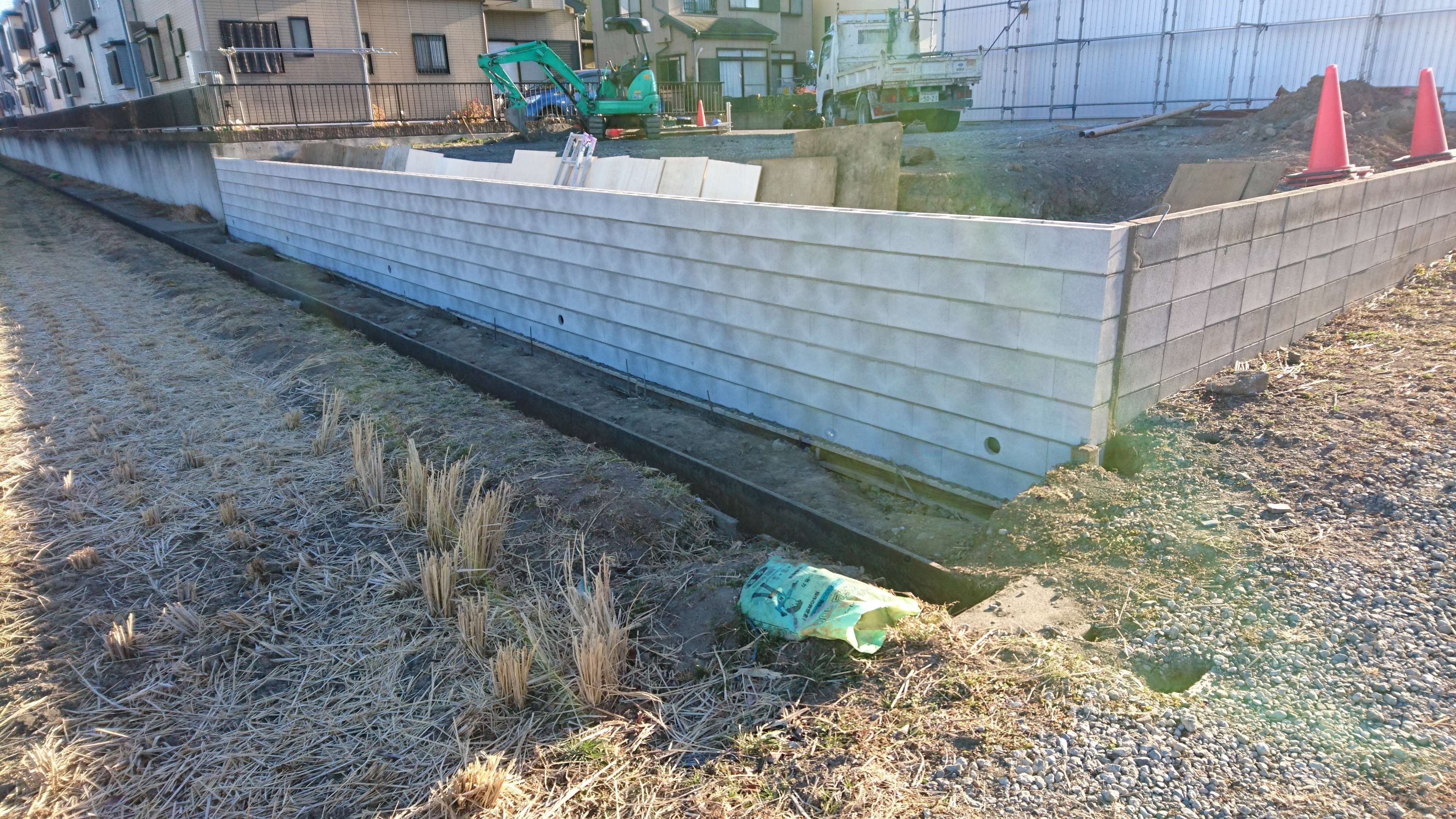 型枠ブロックといって積んだブロックの中に生コンを流し込みます。