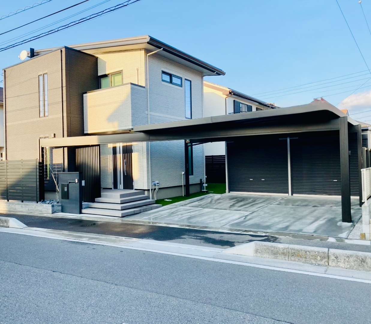 今回の外構の主役とも言えるのが、玄関ポーチの上までシームレスに覆う大型のフラットルーフカーポートです。 住宅の正面の一部としてデザインし、柱やフレームをマットなブラックで統一。これにより、カーポートが後から設置されたものではなく、建物と当初から一体であったかのような高級感と安定感を生み出しています。梁の下にもダウンライトをいれて、夜でも明るく照らせるように施工しました。